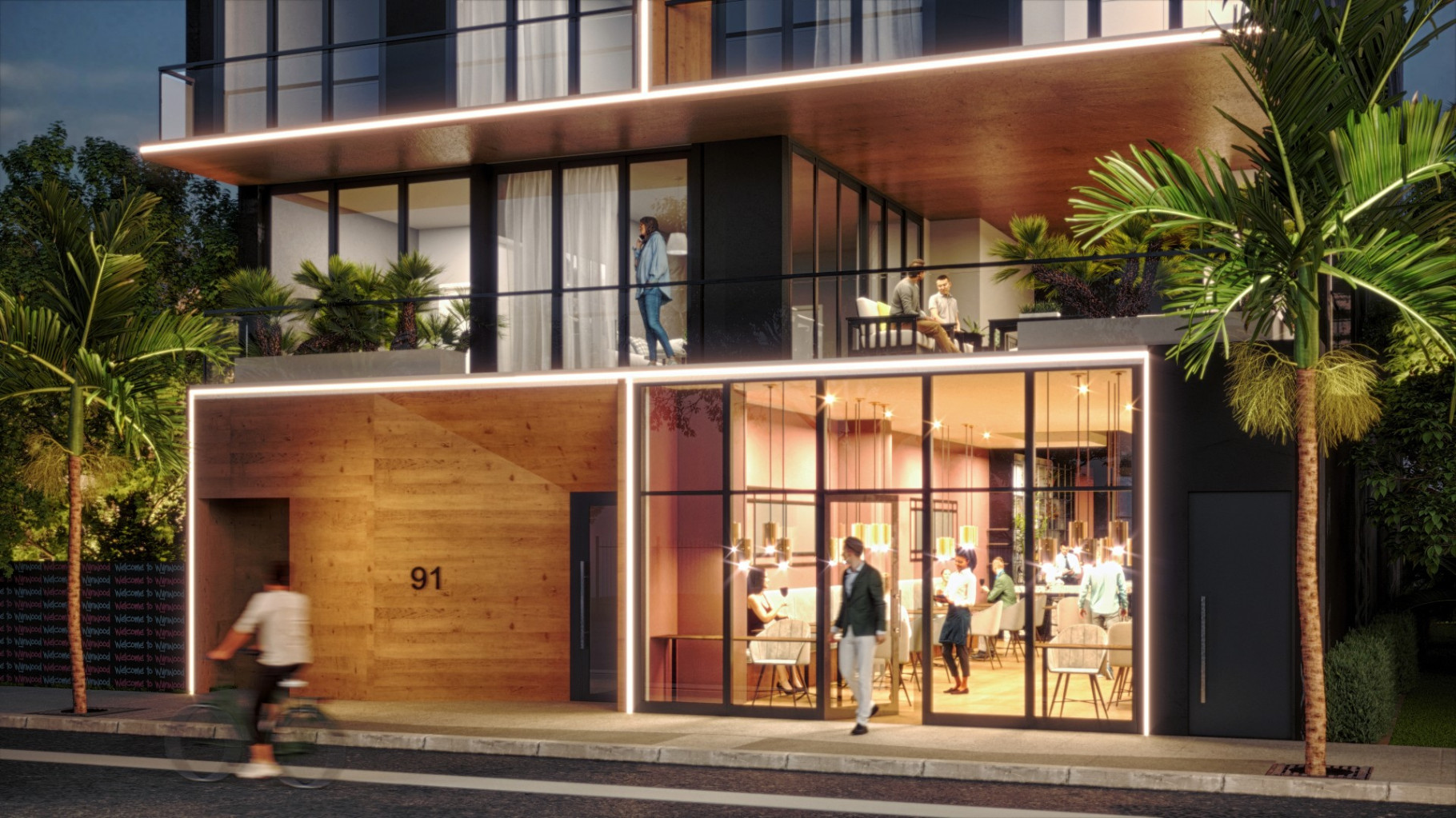 This 5-story residential development features 17 multifamily units and 3,000-SF of ground-floor retail space. The mezzanine units include large terraces overlooking the street, while the penthouse units are designed to maximize outdoor experiences and offer stunning views. The façade is composed of splayed rectangular forms, providing privacy and defined balconies accentuated by linear lighting. Finished in Prodema wood cladding, the exterior combines a refined material palette with a strong geometric composition. The structural design accounted for expansive rooftop terraces equipped with exterior kitchens, bars, and plunge pools.