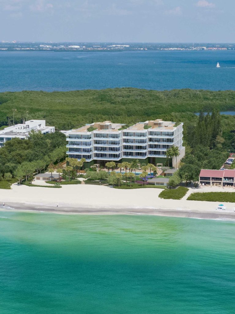 This 5-story, 59,000-SF residential building is located along Gulf of Mexico Drive in Longboat Key and features 16 residences, each offering over 4,000 SF of air-conditioned space. The units are arranged at four per floor above ground-level parking and below a rooftop deck. The building includes private elevators with keyless access to each residence, a partially enclosed garage, a fitness center, and a 24-hour concierge. A 12,000- SF amenity deck on the ground floor is elevated and supported on piles. Situated in Flood Zone V and west of the Coastal Construction Control Line, the site required coastal design considerations, including the use of breakaway walls.