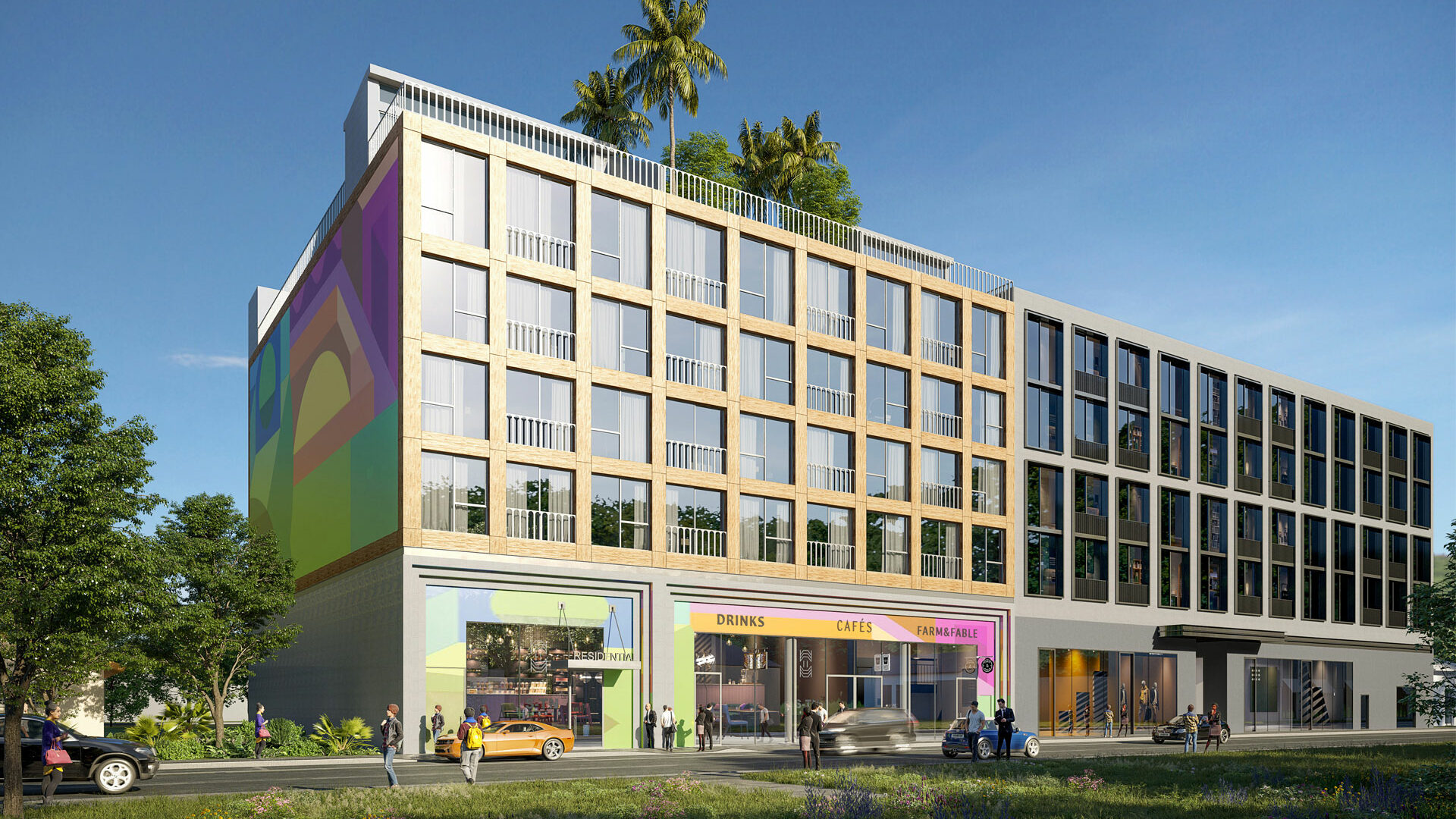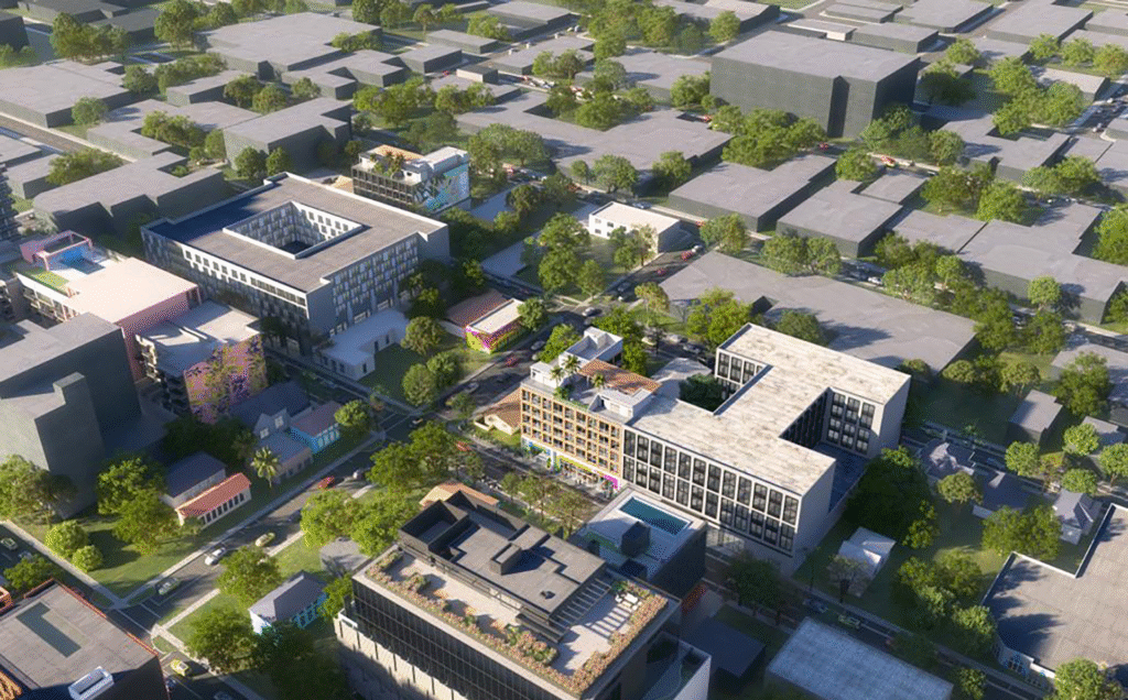 Located at 120 NW 27th Street in Miami, this 5-story building offers retail and residential living within a compact urban property. The ground floor includes 5,200-SF of retail space, while 34 residential units occupy the 4 floors above. The rooftop includes a landscaped terrace with barbecue facilities, providing a shared outdoor amenity for residents. Additional amenities are located on the mezzanine level. A total of 60 parking spaces are provided, including 44 for residents and 16 designated for commercial use. With the building footprint maintaining zero setback from the property line, eccentric foundations were required at the perimeter columns and walls. The total building footprint covers approximately 42,000-SF and reaches a height of 72 feet.